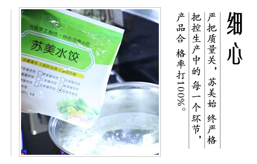 公司產(chǎn)品涵蓋速凍水餃(含手工水餃和大餡水餃)、速凍餛飩、速凍湯圓等三個(gè)系列、30多個(gè)花色品種,主要產(chǎn)品在華東、華西、華北的市場(chǎng)占有率達(dá)18%以上,其中蘇美的芹菜豬肉水餃、韭菜雞蛋水餃以其獨(dú)特的口感,大受消費(fèi)者好評(píng),成為了新晉的網(wǎng)紅美食.